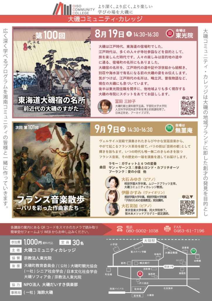 大磯コミュニティ・カレッジでの講座開講のお知らせ 2023年7月26日2023年7月26日個人 9月9日(土)に、無罣庵にて講座を開講いたします。 今回はフランス音楽に焦点を当て、「フランス音楽散歩―パリを彩った作曲家たち―」と題してフランスバロックとパリのサロン文化についてお話しします。 ピアノとヴァイオリンの演奏もたっぷりとお楽しみいただけます!