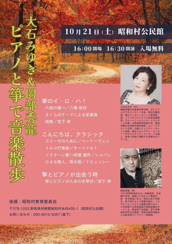 コンサートのお知らせ 2023年10月1日2023年10月20日個人 10月21日(土)に群馬県の昭和村公民館でピアノと箏のコンサートを行います! 箏の魅力に迫る第1部、クラシックの名曲に浸る第2部、そしてピアノと箏のアンサンブルという新しい世界に飛び込む第3部の構成でお送りします。どうぞお楽しみに!