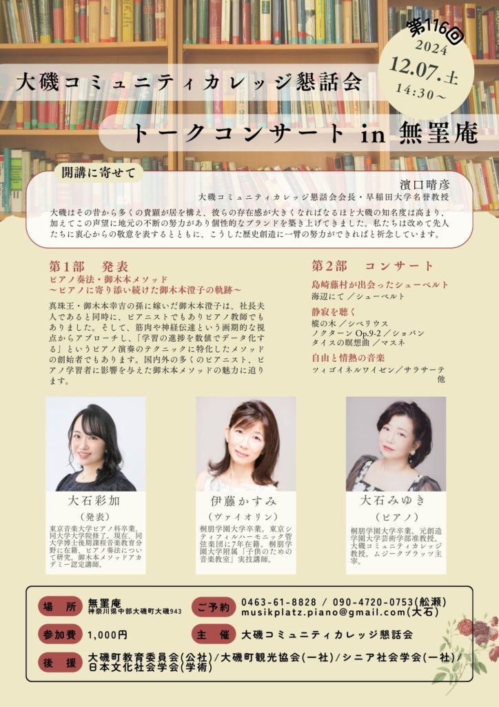 12月7日(土)に、大磯コミュニティカレッジ懇話会主催のトークコンサートを無罣庵にて開催いたします。